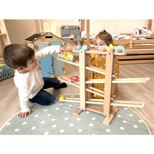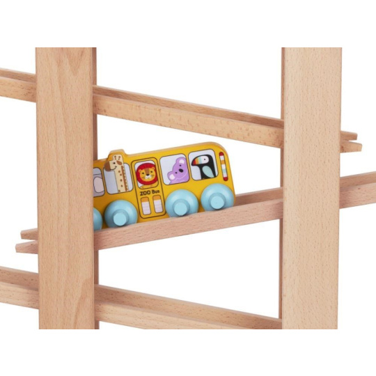 Dřevěná kuličková dráha XL s originálními prvky v podobě parádního závodního autíčka a autobusu se zvířátky ze ZOO ZDARMA nadchne každé dítko. Kuličková dráha z tvrdého přírodního dřeva se 7 zábavnými prvky v krásných barvách zajistí zábavu nejen vaší holčičce nebo chlapci, ale i celé rodině. Stačí správně umístit kuličku, květinu, závodničku nebo bus na začátek dráhy a pak jen sledovat, jakou rychlostí zdolá všechna patra..