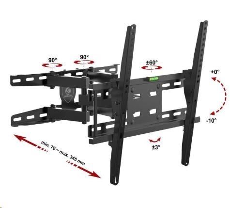 Technické údaje: nosnost 35kg vhodný pro zavěšení LED, OLED, QLED, LCD televizí s úhlopříčkou 26" až 55" podporuje VESA standardy (VESA normy) 200x100 až 400x400 nastavitelná vzdálenost od zdi v rozmezí 70 až 345 mm otáčení do stran +/- 60° náklon 0° až -10° korekce roviny +/- 3° integrovaná vodováha, instalační materiál spolehlivá, bezpečná ocelová konstrukce barevné provedení černé záruka 3 roky Držák LED, OLED, QLED a LCD televize Ergosolid REDOX-K35 podporuje tyto VESA standardy pro uchycení Tv: VESA 200x100 VESA 200x200 VESA 300x200 a 200x300 VESA 300x300 VESA 400x100 VESA 400x200 a 200x400 VESA 400x300 a 300x400 VESA 400x400 Závěsný systém - držák Ergosolid REDOX-K35 je vhodný pro zavěšení všech typů a velkostí televizorů, které mají hmotnost do 35kg a které podporují kterýkoliv z výše uvedených VESA standardů. Uváděné velikosti a typy televizorů jsou pouze orientační - držák je možné použít i na větší televize..