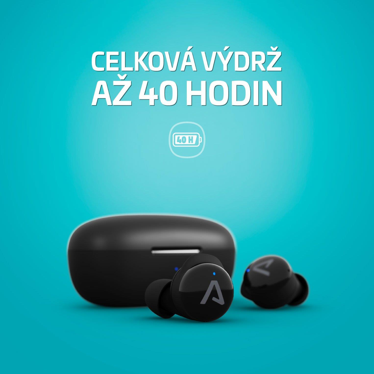 Baterka tě nenechá ve štychu. Špunty zvládnou 9 hodin poslechu a další energie čeká v pouzdru. Hoď do něj sluchátka a za hodinku a půl máš zase 100 % šťávy. Bez zásuvky takhle dáš i 40 hodin!