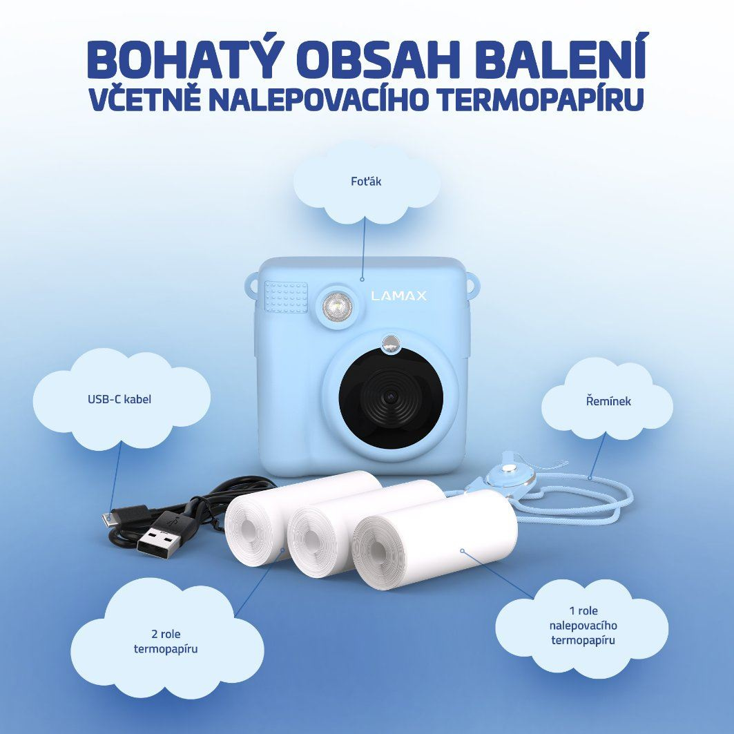 Dětský fotoaparát, okamžitý tisk na termopapír, až 100 fotek na jednu roli, 2.4'' displej, filtry, rámečky, efekty, jednoduché ovládání, nahrávání videa, české prostředí, hry, ukládání na microSD kartu, podpora MP3, bohatá výbava, 2 role termopapíru, 1 role nalepovacího termopapíru, šňůrka na krk..