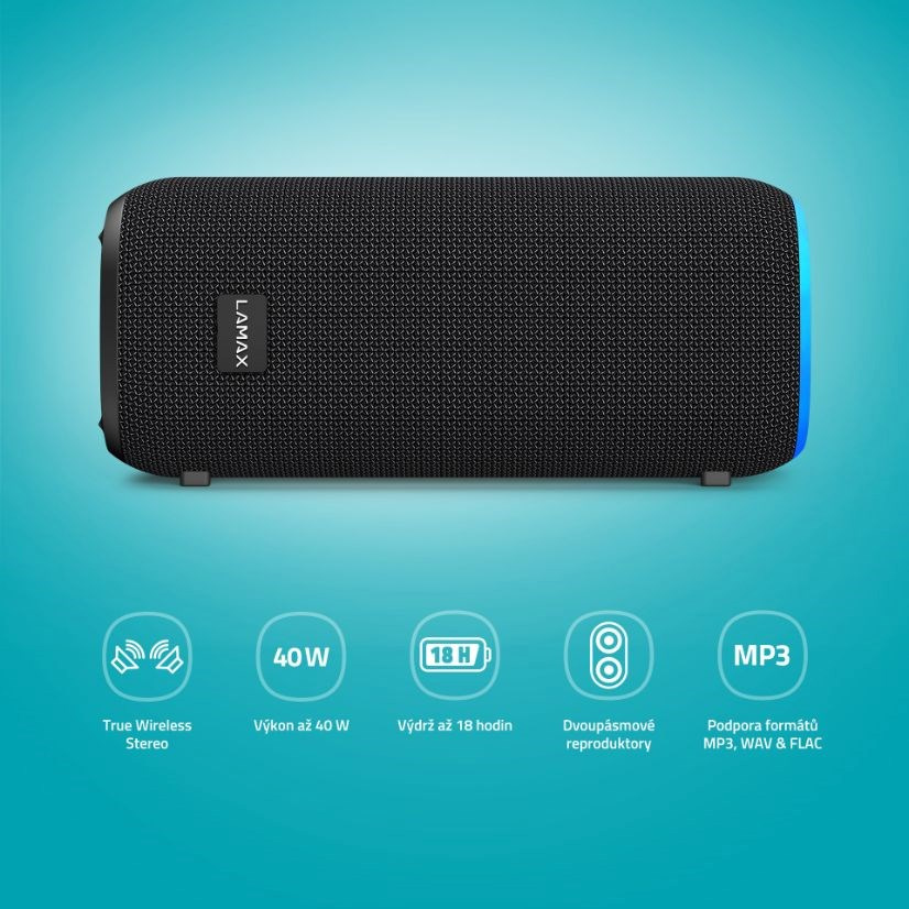 Přenosný bezdrátový reproduktor horizontálního designu, výkon až 40 W, baterie až 18 hodin, 4 nastavitelné LED efekty, TWS funkce, dvoupásmové reproduktory, Bluetooth 5.3, automatické párování, široká variabilita formátů a připojení, USB-C..... více