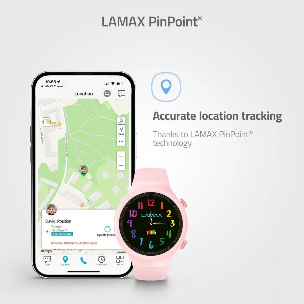 Dětské GPS hodinky, hlasové a textové zprávy, videohovory, určování polohy PinPoint®, bezpečnostní zóny, DualWear®, SOS tlačítko, funkce FriendsConnect® - propojení až 60 kamarádů, propojení všech členů rodiny díky FamilyCareConnect®, aplikace LAMAX Connect v češtině, šifrované spojení, výdrž až 120 hodin, krokoměr, připomínky, voděodolné, 1,2'' barevný dotykový displej s Gorilla Glass, SIM karta 200MB v balení