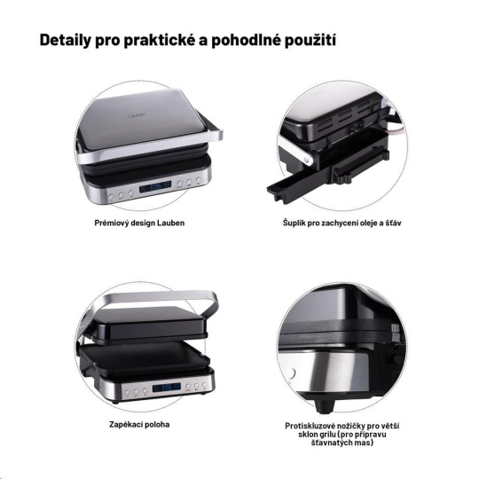 Ke grilování nemusí nutně patřit nošení těžkého uhlí, spousta kouře ani špína. Kontaktní gril Lauben stačí uvést do vodorovné polohy, zvolit jeden z nabízených programů, případně upravit teplotu a čas přípravy, a pak už se jen těšit na dokonalý výsledek. Gril je velmi nenáročný na údržbu, přebytečné tekutiny odtékají do odkapávací misky a plotýnky jsou vhodné do myčky nádobí, takže odpadá starost se zdlouhavým čištěním. S obsluhou grilu si poradí každý, k ovládání slouží 6 tlačítek a přehledný LED displej. Polohu grilu nastavíte pomocí rukojeti, která disponuje Cool Touch funkcí, takže se o ní nikdy nespálíte. Vše, co potřebujete vědět k obsluze a manipulaci, se dozvíte z video tutorialu.