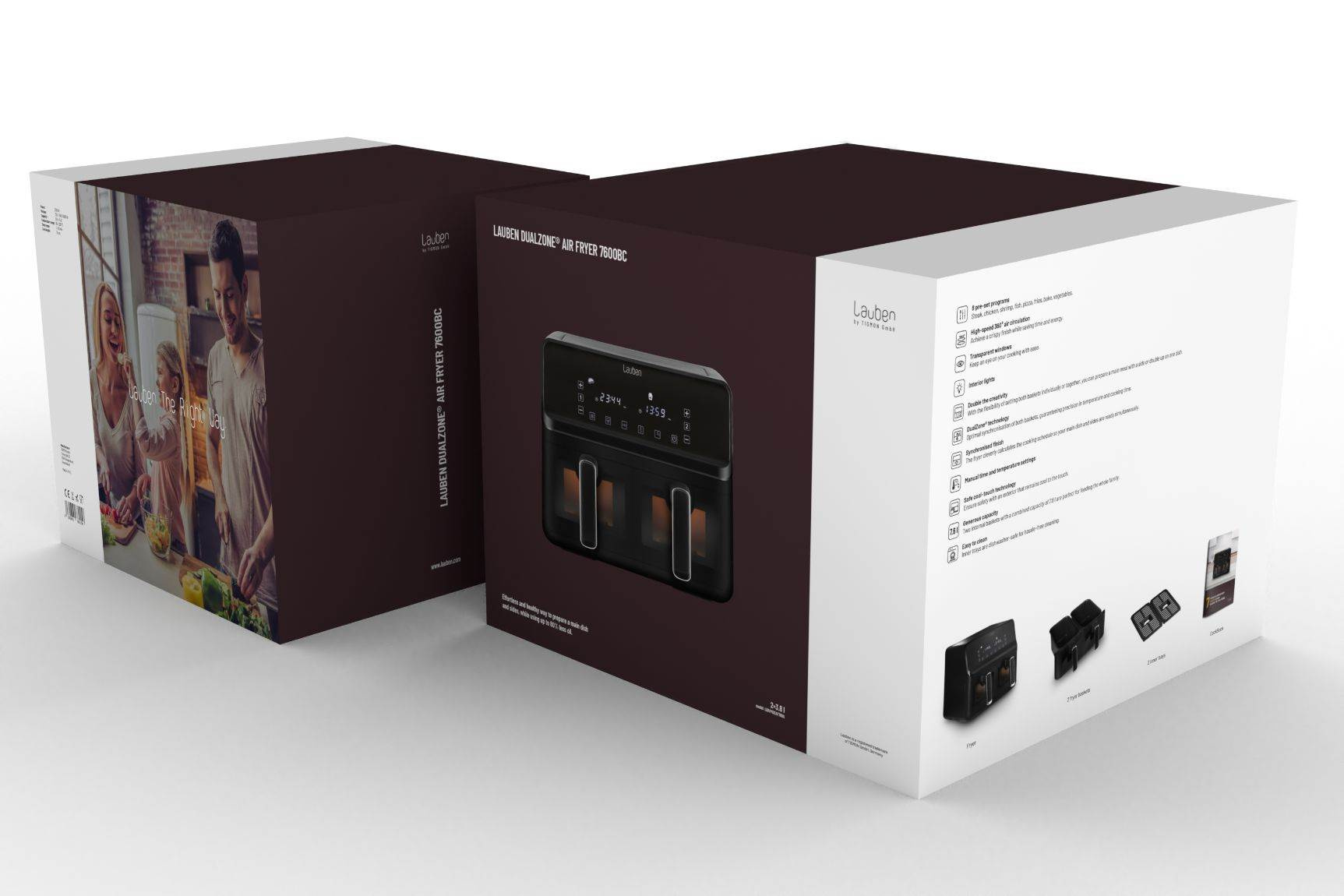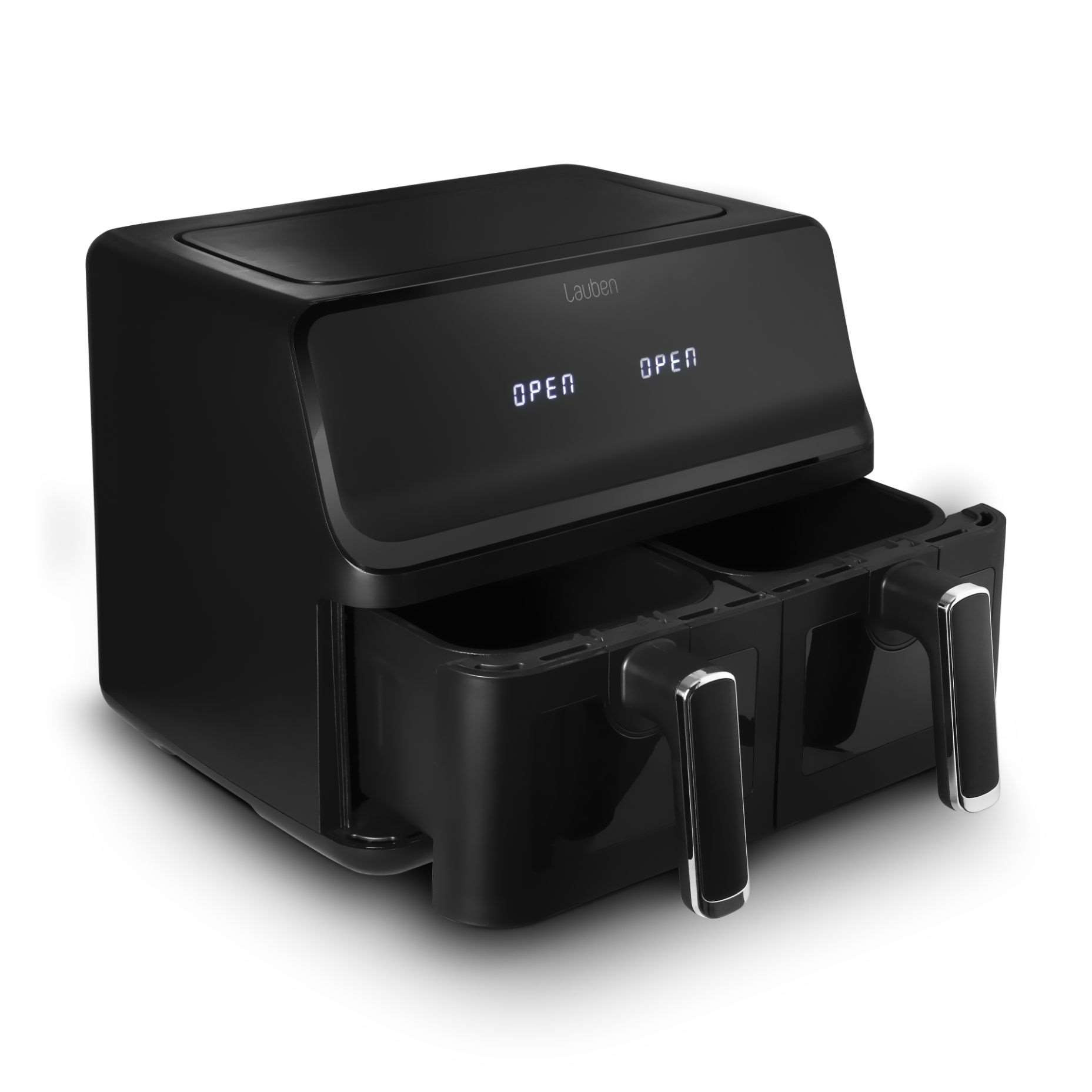 Horkovzdušná fritéza s dvěma koši, celkový objem 8 l, individuální nastavení obou košů zvlášť, možnost přípravy hlavního jídla a přílohy naráz, osvětlení interiéru, průhledná okénka pro vizuální kontrolu pokrmu, 8 přednastavených programů, možnost manuální úpravy času a teploty, technologie Cool Touch a Dualzone®, funkce předehřátí a synchronizované ukončení, přehledný dotykový displej, vnitřní tácy vhodné do myčky, prémiový matný design, 360° cirkulace horkého vzduchu, nastavitelná teplota: 80 – 200 °C, nastavení času 1 – 60 min, příkon 2700 W.