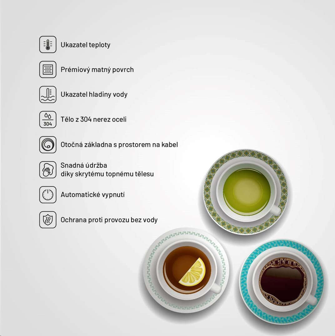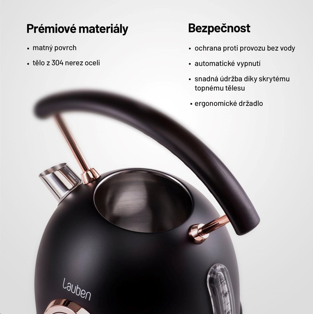 Rychlovarná konvice je jistě nepostradatelnou součástí každé kuchyně. Může být ale zároveň stylovým doplňkem, který pozvedne váš interiér na vyšší úroveň. Lauben Electric Kettle 17BC je designová rychlovarná konvice ve stylu Artdeco s prémiovým matným povrchem z #304 nerezové oceli. Údržba konvice je snadná, topné těleso je skryto, tudíž se méně zanáší a konvice se lépe čistí. Mysleli jsme i na bezpečnost, konvice má pojistku proti přehřátí i vaření bez vody. Aktuální teplotu vody můžete sledovat na teploměru na konvici. Potřebujete-li zalít zelený čaj, nemusíte čekat, až voda vychladne, ale stačí prostě včas vypnout. Díky svému designu konvice nejen dobře vypadá, ale je i praktická. Základna je otočná o 360° pro jednoduchou manipulaci a samozřejmostí je prostor pro skrytí kabelu, který jinak překáží a nevypadá hezky.