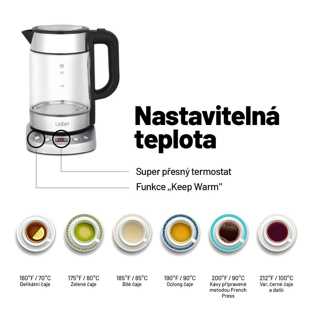 Teplota přesně, jak má býtLauben Electric Kettle EK17GS je designová rychlovarná konvice s nastavitelnou teplotou ohřevu vody a Keep Warm funkcí. Možnost nastavení teploty vody v kuchyni jistě oceníte. Potřebujete zalít zelený čaj? Už nikdy nemusíte čekat, až voda vychladne, stačí si preferovanou teplotu zvolit na přehledném LCD displeji.