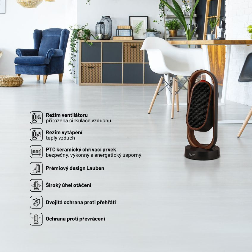 Dokonalý high end Lauben design se vyjímá v každém prostoru a 20 m2 dokonale ovládne i díky širokému úhlu záběru, kdy se do stran pohybuje až v úhlu 80° a nahoru/dolů v úhlu 45°. Nejen funkčnost a design jsou však důležité, na prvním místě stojí bezpečnost. Tu zajišťuje dvojitá pojistka proti přehřátí a pojistka proti převrhnutí, které v krizové situaci přístroj vypnou.