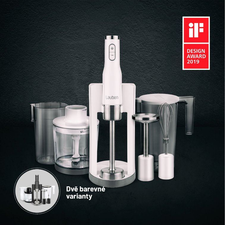 Lauben Stick Blender je příkladem důmyslné kombinace funkčního a stylového designu, za který mu právem náleží prestižní ocenění IF Design. Nejen, že dobře vypadá, ale díky ergonomickému tvaru a protiskluzové úpravě se s ním velmi snadno manipuluje a dobře se drží. Tělo mixéru je zároveň dostatečně robustní, takže nad ním máte absolutní kontrolu. Oceníte i praktický stojan, do kterého umístíte všechny nástavce. Mixér vám v kuchyni nebude zabírat tolik místa a vaše kuchyňské skříňky zůstanou uklizené. Na výběr máte ze dvou barevných variant.