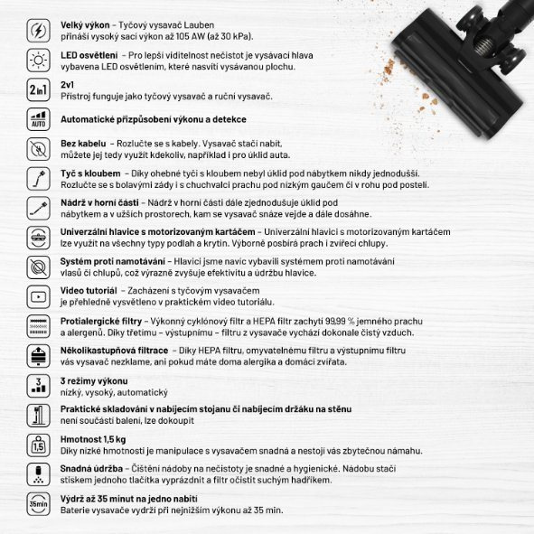 Vysaje každý povrch s minimálním úsilímRychlý a efektivní úklid nemusí být pouhým snem. Stačí si pořídit šikovné pomocníky. K takovým patří i Lauben Stick Vacuum 2in1 Pet Plus 400BC s vysokým sacím výkonem až 105 AW, který se automaticky přizpůsobí stupni znečištění. Nečistoty jsou ještě lépe viditelné díky LED osvětlení vysávané plochy. Umístění sběrné nádoby v horní části spolu s flexibilní tyčí s kloubem umožňuje snadné vysávání i prostor pod nábytkem či užších míst, nádobu následně zcela hygienicky vysypete. Velmi praktická je hlavice se systémem proti namotávání vlasů a zvířecích chlupů a univerzálním motorizovaným kartáčem na všechny typy podlah. Tyčový vysavač v mžiku proměníte v ruční vysavač, bezkabelové provedení poskytuje možnost využití kdekoliv. Přístroj se pyšní stylovým designem a návodný video tutoriál demonstruje správné zacházení s vysavačem.