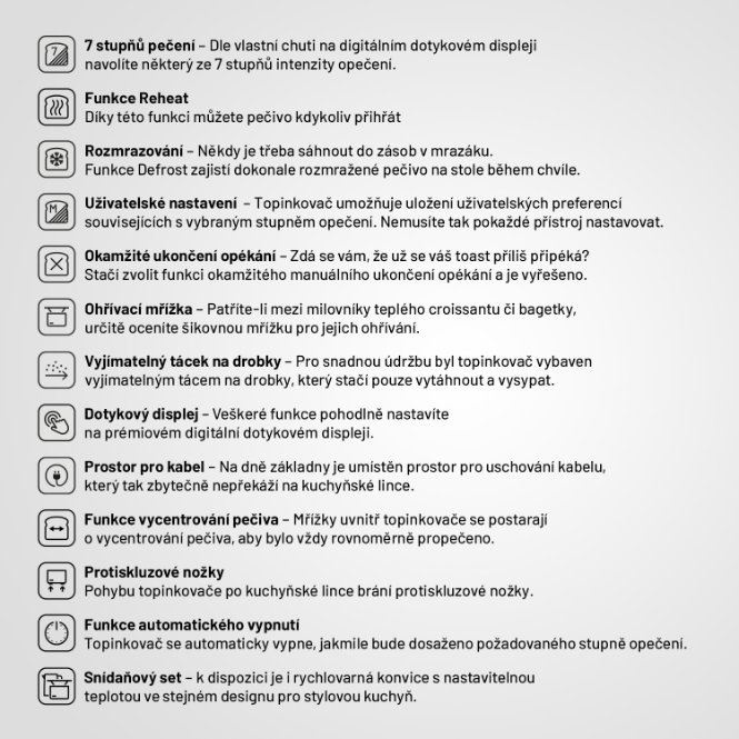 Topinkovač pro 2 ks pečiva, 7 stupňů ohřevu, uživatelská paměť, ohřívací mřížka na větší pečivo, vyjímatelná miska na drobky, funkce vycentrování pro rovnoměrné opečení, funkce rozmrazování, funkce opětovného ohřevu, tlačítko Cancel pro okamžité ukončení opékání, úložný prostor pro kabel, protiskluzové nožičky, příkon 900 W, snídaňový set – rychlovarná konvice s nastavitelnou teplotou ve stejném designu v nabídce.... více