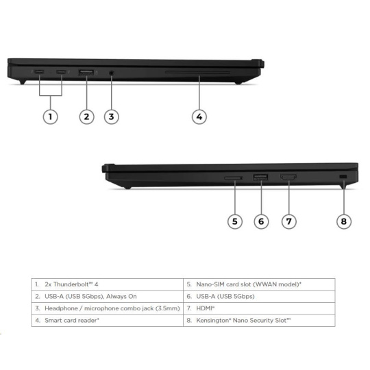 | Standartné porty | 2x USB-A (USB 5Gbps / USB 3.2 Gen 1), one Always On 2x USB-C® (Thunderbolt™ 4 / USB4® 40Gbps), with USB PD 3.1 and DisplayPort™ 2.1 1x HDMI® 2.1, up to 4K/60Hz 1x Headphone / microphone combo jack (3.5mm) Optional Ports (configured) 1x Smart Card Reader 1x Nano-SIM Card Slot |