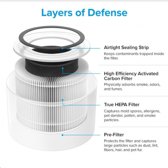 Druhou vrstvou je HEPA filtr H13. To odlišuje Levoit od konkurence, protože filtr HEPA H13 je mnohem kvalitnější a spolehlivější než běžně používané HEPA H11. Tu se odfiltrují jemné prachové částice, plíseň, bakterie, pyl, kouřové částice, roztoče a srst.
