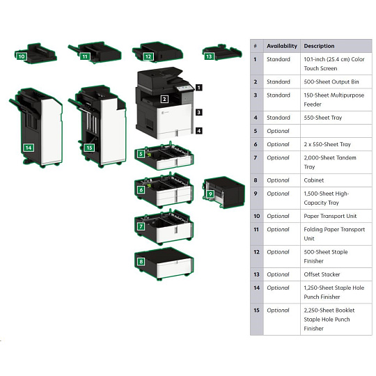 .Part Number 20L8250 Print Technology Color Laser Function Color Copying Color Faxing Color Printing Color Scanning Trusted Platform Module (TPM) The Trusted Platform Module (TPM) is not available in some countries. Workgroup Size Large Workgroup Touch Screen Display Yes Display Lexmark e-Task 10-inch (25 cm) class color touch screen Print Speed (Letter, Black) Up to 45 ppm4 Print Speed (Letter, Color) Up to 45 ppm4 Print Speed (Letter, Black) Duplex Up to 45 spm4 Print Speed (Letter, Color) Duplex Up to 45 spm4 Time to First Page (Black) As fast as 7.1 seconds Time to First Page (Color) As fast as 8.2 seconds Duplex (2-sided) Printing Integrated Duplex Print Resolution, Black 1200 x 1200 dpi 4800 Color Quality Print Resolution, Color 1200 x 1200 dpi 4800 Color Quality Copy Speed (Letter, Black) Up to 45 cpm4 Copy Speed (Letter, Color) Up to 45 cpm4 Copy Speed (Letter, Black) Duplex Up to 45 spm4 Copy Speed (Letter, Color) Duplex Up to 45 spm4 Time to First Copy (Black) As fast as 8.5 seconds Time to First Copy (Color) As fast as 9.5 seconds Reduce / Enlarge Range 25 - 400 % A4/Ltr Simplex Scan Speed (Black) Up to 120/120 sides per minute A4/Ltr Simplex Scan Speed (Color) Up to 120/120 sides per minute A4/Ltr Duplex Scan Speed (Black) Up to 240/240 sides per minute A4/Ltr Duplex Scan Speed (Color) Up to 240/240 sides per minute Scan Area, Maximum 11.69 x 17.0 inches ADF Scan DADF (single pass Duplex) Scanner Type Flatbed scanner with automatic document feeder Scan Resolution, Enhanced 600 x 600 dpi Scan Resolution, Optical 300 x 300 dpi Optical Scanning Resolution 300 X 300 dpi Scan File Formats (Send as) JPEG, JPG PDF Secure PDF TIFF Archival PDF (A-1a, A-1b) Searchable PDF TXT RTF DOCX Scan Destinations e-mail FTP USB Flash drive USB or Network connected computer Processor Speed Quad Core, 1.2 GHz Memory, Standard 4 GB Memory, Maximum 4 GB Hard Disk Intelligent Storage Drive included; Magnetic Hard Disk available Apple Operating Systems Supported Support is provided through AirPrint and AirScan only Citrix MetaFrame Microsoft Windows Server 2012 R2 Datacenter Edition running Citrix XenApp 7.5, 6, 7, 8, 9, 11, 12, 13, 14, 15, 16 Microsoft Windows Server 2012 Datacenter Edition running Citrix XenApp 7.5, 6, 7, 8, 9, 11, 12, 13, 14, 15, 16 Microsoft Windows Server 2012 Foundation running Citrix XenApp 6.0, 6.5 Microsoft Windows Server 2012 Essentials running Citrix XenApp 6.0, 6.5 Microsoft Windows Server 2012 Standard running Citrix XenApp 6.0, 6.5 Linux Operating Systems Supported Ubuntu 20.04 Debian 10 SUSE Linux Enterprise Server 12 SP5 OpenSUSE 15.2 Debian 11 Ubuntu 22.04 Fedora 36 Fedora 37 SUSE Linux Enterprise Server 15 SP4 OpenSUSE 15.4 Red Hat Linux 8.7 Red Hat Linux 9.1 Microsoft Windows Operating Systems Supported Windows Vista Windows Vista x64 Windows Server 2008 Windows Server 2008 x64 Windows Server 2008 running Terminal Services Windows Server 2008 x64 running Terminal Services Windows 7 Windows 7 x64 Windows Server 2008 R2 Windows Server 2008 R2 running Terminal Services Windows 8 Windows 8 x64 Windows Server 2012 Windows 8.1 Windows Server 2012 R2 Windows 10 Windows Server 2016 Windows Server 2019 Windows Server 2022 Windows 11 Novell Operating Systems Supported Novell NetWare 6.5 Open Enterprise Server Novell Open Enterprise Server 2 (SP3) on SuSE Linux Enterprise Server 10 SP4 (x86 and x64) 3 Novell Open Enterprise Server 11 (SP3) on SuSE Linux Enterprise Server 11 SP4 (x86 and x64) Novell Open Enterprise Server 11 (SP3) on SuSE Linux Enterprise Server 12 SP1 (x86 and x64) Novell Open Enterprise Server 15 (SP1) on SuSE Linux Enterprise Server 11 SP4 (x86 and x64) Other Operating Systems Supported Virtually any platform supporting TCP/IP Included Paper Handling 550-Sheet Tray 150-Sheet Multipurpose Feeder 500-Sheet Output Bin Optional Paper Handling 550-Sheet Tray Offset Stacker 500-Sheet Staple Offset Finisher 2 x 550-Sheet Tray 2000-Sheet Tandem Tray Cabinet 1,500-Sheet High-Capacity Tray Paper Transport Unit Folding Paper Transport Unit 1,250-Sheet Staple Hole Punch Finisher 2,250-Sheet Booklet Staple Hole Punch Finisher Paper Input Capacity, Standard Up to 700 pages 20 lb or 75 gsm bond Paper Input Capacity, Maximum Up to 4750 pages 20 lb or 75 gsm bond Paper Output Capacity, Standard Up to 500 pages 20 lb or 75 gsm bond Paper Output Capacity, Maximum Up to 2650 pages 20 lb or 75 gsm bond Paper Weight Range Supported - Standard Tray (lb.) 16 - 80 lb. Paper Weight Range Supported - Multipurpose Feeder (lb.) 16 - 80 lb. A3 / 11 x 17 Yes ADF 300-Sheet Automatic Document Feeder ADF Paper Input Capacity Up to 300 pages 20 lb or 75 gsm bond ADF Paper Output Capacity Up to 300 pages 20 lb or 75 gsm bond Finishing Option Yes Finishing Functions Offset stacking Stapling Hole punching Number of Paper Inputs, Standard 2 Number of Paper Inputs, Maximum 6 Media Types Supported Card Stock Envelopes Glossy Paper Labels Plain Paper Vinyl Labels Refer to the Paper & Specialty Media Guide Media Sizes Supported 10 Envelope 7 3/4 Envelope 9 Envelope A3 A4 A5 B5 Envelope C4 Envelope C5 Envelope DL Envelope Hagaki Card Executive Folio JIS-B4 JIS-B5 Ledger Legal Letter Statement Oficio A6 SRA3 Standard Ports USB 2.0 Specification Hi-Speed Certified (Type B) Gigabit Ethernet (10/100/1000) Front USB 2.0 Specification Hi-Speed Certified port (Type A) 802.11a/b/g/n/ac + Apple iBeacon Optional Local Ports Internal RS-232C serial Internal 1284-B Bidirectional Parallel Optional Network Ports MarkNet N8230 Fiber Ethernet Print Server Direct USB Yes Ethernet Network Yes Wireless Yes Wireless Network WPA2™ - Personal WPA™ and WPA2™ - Personal 802.1x Authentication: MD5, MSCHAPv2, LEAP, PEAP, TLS, TTLS Network Protocol Support TCP UDP IPSEC w/ IPv4 IPSEC w/ IPv6 ICMP IGMP IPv4 IPv6 Network Printing Methods Direct IP (Port 9100) Enhanced IP (Port 9400) FTP IPP 1.0, 1.1, 2.0 (Internet Printing Protocol) Microsoft Web Services WSD Pull Printing Thin Print LPR Network Management Protocols WINS AP