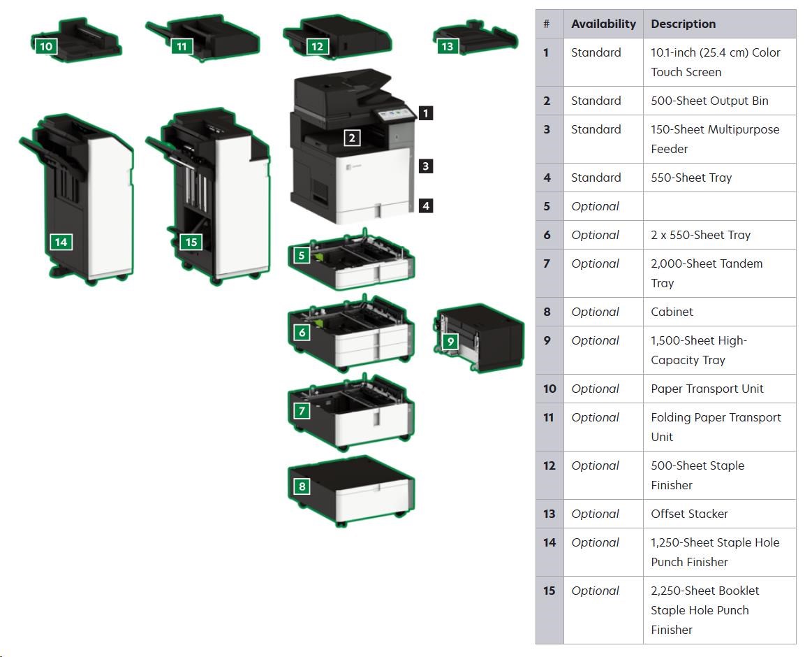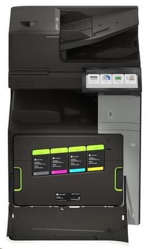 .Part Number 20L8250 Print Technology Color Laser Function Color Copying Color Faxing Color Printing Color Scanning Trusted Platform Module (TPM) The Trusted Platform Module (TPM) is not available in some countries. Workgroup Size Large Workgroup Touch Screen Display Yes Display Lexmark e-Task 10-inch (25 cm) class color touch screen Print Speed (Letter, Black) Up to 45 ppm4 Print Speed (Letter, Color) Up to 45 ppm4 Print Speed (Letter, Black) Duplex Up to 45 spm4 Print Speed (Letter, Color) Duplex Up to 45 spm4 Time to First Page (Black) As fast as 7.1 seconds Time to First Page (Color) As fast as 8.2 seconds Duplex (2-sided) Printing Integrated Duplex Print Resolution, Black 1200 x 1200 dpi 4800 Color Quality Print Resolution, Color 1200 x 1200 dpi 4800 Color Quality Copy Speed (Letter, Black) Up to 45 cpm4 Copy Speed (Letter, Color) Up to 45 cpm4 Copy Speed (Letter, Black) Duplex Up to 45 spm4 Copy Speed (Letter, Color) Duplex Up to 45 spm4 Time to First Copy (Black) As fast as 8.5 seconds Time to First Copy (Color) As fast as 9.5 seconds Reduce / Enlarge Range 25 - 400 % A4/Ltr Simplex Scan Speed (Black) Up to 120/120 sides per minute A4/Ltr Simplex Scan Speed (Color) Up to 120/120 sides per minute A4/Ltr Duplex Scan Speed (Black) Up to 240/240 sides per minute A4/Ltr Duplex Scan Speed (Color) Up to 240/240 sides per minute Scan Area, Maximum 11.69 x 17.0 inches ADF Scan DADF (single pass Duplex) Scanner Type Flatbed scanner with automatic document feeder Scan Resolution, Enhanced 600 x 600 dpi Scan Resolution, Optical 300 x 300 dpi Optical Scanning Resolution 300 X 300 dpi Scan File Formats (Send as) JPEG, JPG PDF Secure PDF TIFF Archival PDF (A-1a, A-1b) Searchable PDF TXT RTF DOCX Scan Destinations e-mail FTP USB Flash drive USB or Network connected computer Processor Speed Quad Core, 1.2 GHz Memory, Standard 4 GB Memory, Maximum 4 GB Hard Disk Intelligent Storage Drive included; Magnetic Hard Disk available Apple Operating Systems Supported Support is provided through AirPrint and AirScan only Citrix MetaFrame Microsoft Windows Server 2012 R2 Datacenter Edition running Citrix XenApp 7.5, 6, 7, 8, 9, 11, 12, 13, 14, 15, 16 Microsoft Windows Server 2012 Datacenter Edition running Citrix XenApp 7.5, 6, 7, 8, 9, 11, 12, 13, 14, 15, 16 Microsoft Windows Server 2012 Foundation running Citrix XenApp 6.0, 6.5 Microsoft Windows Server 2012 Essentials running Citrix XenApp 6.0, 6.5 Microsoft Windows Server 2012 Standard running Citrix XenApp 6.0, 6.5 Linux Operating Systems Supported Ubuntu 20.04 Debian 10 SUSE Linux Enterprise Server 12 SP5 OpenSUSE 15.2 Debian 11 Ubuntu 22.04 Fedora 36 Fedora 37 SUSE Linux Enterprise Server 15 SP4 OpenSUSE 15.4 Red Hat Linux 8.7 Red Hat Linux 9.1 Microsoft Windows Operating Systems Supported Windows Vista Windows Vista x64 Windows Server 2008 Windows Server 2008 x64 Windows Server 2008 running Terminal Services Windows Server 2008 x64 running Terminal Services Windows 7 Windows 7 x64 Windows Server 2008 R2 Windows Server 2008 R2 running Terminal Services Windows 8 Windows 8 x64 Windows Server 2012 Windows 8.1 Windows Server 2012 R2 Windows 10 Windows Server 2016 Windows Server 2019 Windows Server 2022 Windows 11 Novell Operating Systems Supported Novell NetWare 6.5 Open Enterprise Server Novell Open Enterprise Server 2 (SP3) on SuSE Linux Enterprise Server 10 SP4 (x86 and x64) 3 Novell Open Enterprise Server 11 (SP3) on SuSE Linux Enterprise Server 11 SP4 (x86 and x64) Novell Open Enterprise Server 11 (SP3) on SuSE Linux Enterprise Server 12 SP1 (x86 and x64) Novell Open Enterprise Server 15 (SP1) on SuSE Linux Enterprise Server 11 SP4 (x86 and x64) Other Operating Systems Supported Virtually any platform supporting TCP/IP Included Paper Handling 550-Sheet Tray 150-Sheet Multipurpose Feeder 500-Sheet Output Bin Optional Paper Handling 550-Sheet Tray Offset Stacker 500-Sheet Staple Offset Finisher 2 x 550-Sheet Tray 2000-Sheet Tandem Tray Cabinet 1,500-Sheet High-Capacity Tray Paper Transport Unit Folding Paper Transport Unit 1,250-Sheet Staple Hole Punch Finisher 2,250-Sheet Booklet Staple Hole Punch Finisher Paper Input Capacity, Standard Up to 700 pages 20 lb or 75 gsm bond Paper Input Capacity, Maximum Up to 4750 pages 20 lb or 75 gsm bond Paper Output Capacity, Standard Up to 500 pages 20 lb or 75 gsm bond Paper Output Capacity, Maximum Up to 2650 pages 20 lb or 75 gsm bond Paper Weight Range Supported - Standard Tray (lb.) 16 - 80 lb. Paper Weight Range Supported - Multipurpose Feeder (lb.) 16 - 80 lb. A3 / 11 x 17 Yes ADF 300-Sheet Automatic Document Feeder ADF Paper Input Capacity Up to 300 pages 20 lb or 75 gsm bond ADF Paper Output Capacity Up to 300 pages 20 lb or 75 gsm bond Finishing Option Yes Finishing Functions Offset stacking Stapling Hole punching Number of Paper Inputs, Standard 2 Number of Paper Inputs, Maximum 6 Media Types Supported Card Stock Envelopes Glossy Paper Labels Plain Paper Vinyl Labels Refer to the Paper & Specialty Media Guide Media Sizes Supported 10 Envelope 7 3/4 Envelope 9 Envelope A3 A4 A5 B5 Envelope C4 Envelope C5 Envelope DL Envelope Hagaki Card Executive Folio JIS-B4 JIS-B5 Ledger Legal Letter Statement Oficio A6 SRA3 Standard Ports USB 2.0 Specification Hi-Speed Certified (Type B) Gigabit Ethernet (10/100/1000) Front USB 2.0 Specification Hi-Speed Certified port (Type A) 802.11a/b/g/n/ac + Apple iBeacon Optional Local Ports Internal RS-232C serial Internal 1284-B Bidirectional Parallel Optional Network Ports MarkNet N8230 Fiber Ethernet Print Server Direct USB Yes Ethernet Network Yes Wireless Yes Wireless Network WPA2™ - Personal WPA™ and WPA2™ - Personal 802.1x Authentication: MD5, MSCHAPv2, LEAP, PEAP, TLS, TTLS Network Protocol Support TCP UDP IPSEC w/ IPv4 IPSEC w/ IPv6 ICMP IGMP IPv4 IPv6 Network Printing Methods Direct IP (Port 9100) Enhanced IP (Port 9400) FTP IPP 1.0, 1.1, 2.0 (Internet Printing Protocol) Microsoft Web Services WSD Pull Printing Thin Print LPR Network Management Protocols WINS AP