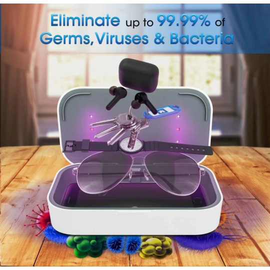 - Sanitizes smartphones, watches, keys, jewelry, credit cards, masks, pacifiers, earbuds and more