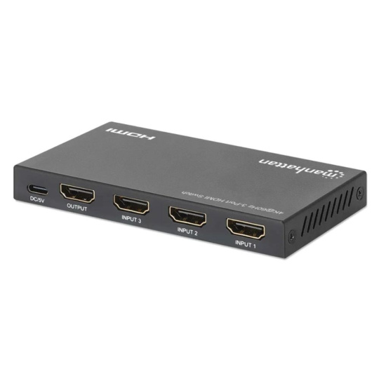 Manhattan 3portový HDMI přepínač umožňuje spolehlivé a pohodlné přepínání mezi třemi různými HDMI zdroji a jedním displejem. Podporuje rozlišení až Ultra-HD 4K při 60 Hz a nabízí automatické přepínání na právě aktivní zařízení, stejně jako manuální volbu pomocí IR dálkového ovladače nebo tlačítka. Díky šířce pásma až 18 Gb/s, chroma subsamplingu 4:4:4 a podpoře HDR, Dolby Vision a Dolby Atmos poskytuje živé barvy a ostrý kontrast bez degradace obrazu. Kompatibilní je napříč různými zařízeními – herní konzole, streamovací boxy, notebooky nebo Blu-ray přehrávače.