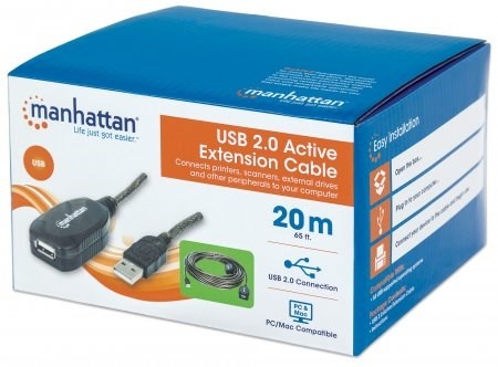 Use the Manhattan Hi-Speed USB Active Cable to connect a computer USB port to a USB device almost anywhere in the room. Daisy-chain 2 cable extensions to provide a convenient, 40m (131-ft.) connection. Manhattan Hi-Speed USB Active Cable with built-it repeater is fully-compliant with USB 1.1 and Hi-Speed USB specifications to help devices operate at maximum performance. Plug-and-play capability, Windows/Macintosh versatility and no external power or driver requirements help provide greater flexibility in computer and peripheral placement and office layout.