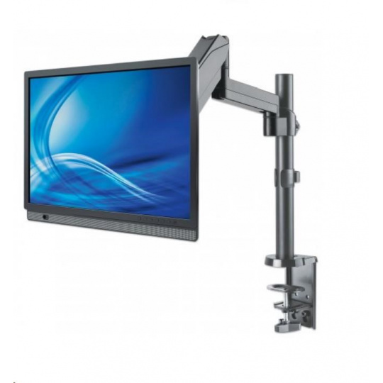 The Manhattan Universal Gas Spring Monitor Mount securely supports one 17" to 32" TV or monitor. Because it uses a gas spring to hold your display, its arm only needs the lightest touch to move your screen to the best viewing angle for you. The mount's high-quality aluminum and steel construction will provide years of reliable service. Ideal for installation on a standard-sized desk, the Manhattan Universal Gas Spring Monitor Mount lets you take advantage of the extra range of movement so you can have more space to get work done.