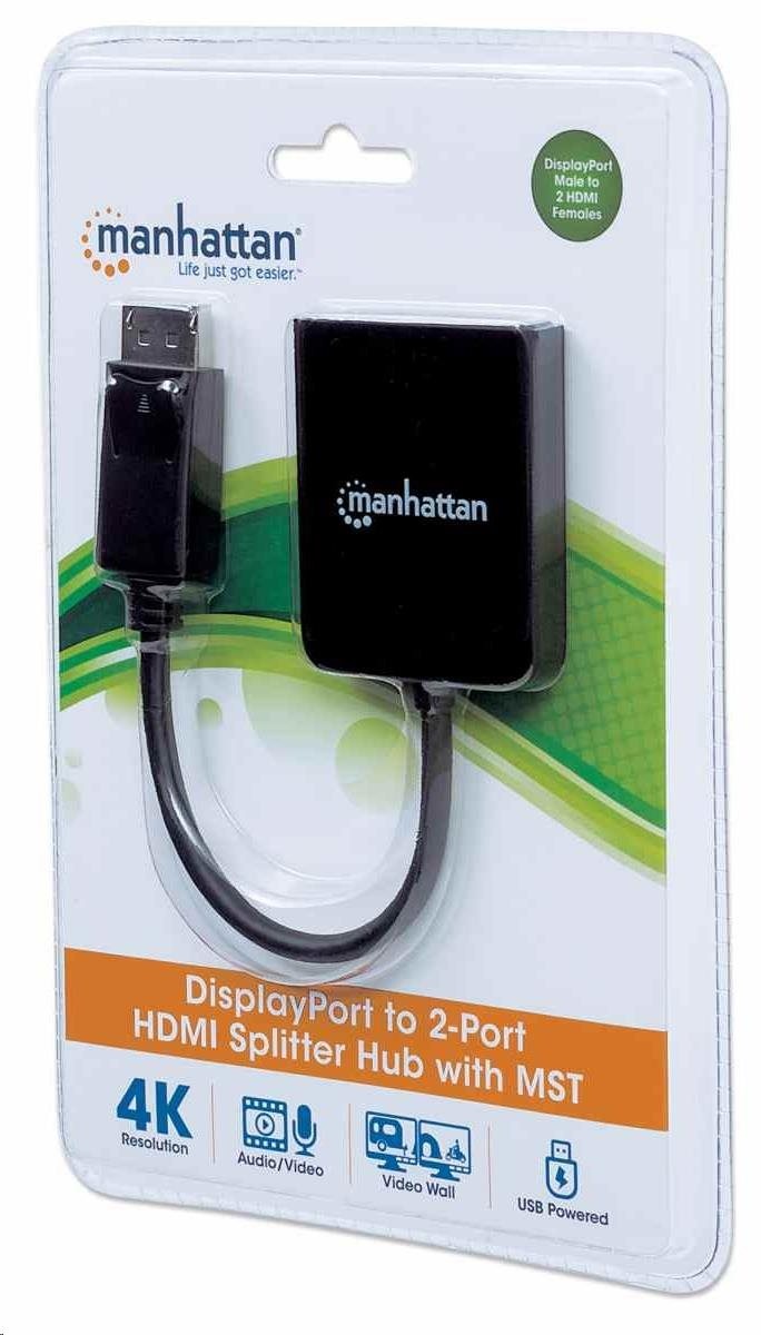 The Manhattan DisplayPort to Dual HDMI - MST Hub streams a 4K DisplayPort (DP) signal from a single UHD source to up to two UHD HDMI displays.