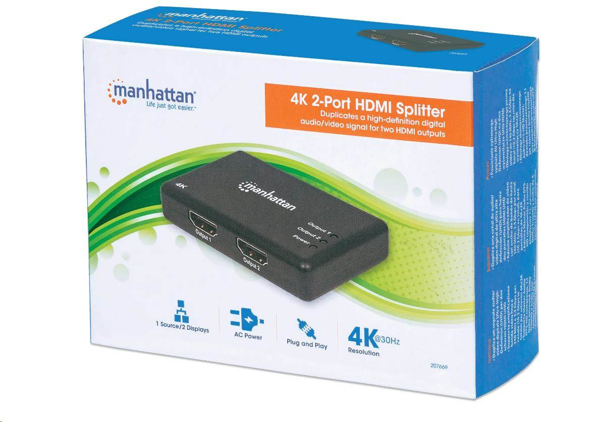 The Manhattan 4K 2-Port HDMI Splitter with built-in booster streams a 4K HDMI signal from a single UHD source to up to two UHD displays.