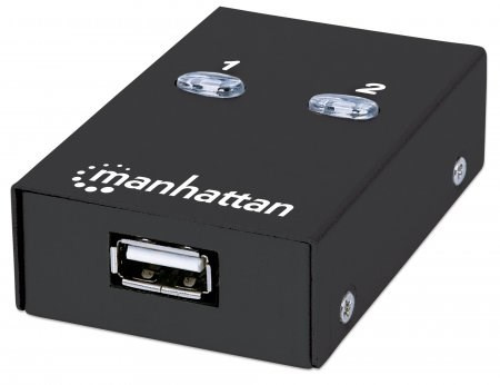 The Manhattan Hi-Speed USB 2.0 Automatic Sharing Switch easily allows two computers to share a USB device. It's ideal for home and office use where users need to share a USB cable modem, printer, digital camera, scanner, external storage drive or other peripheral. Use the convenient access-on-demand switching for activation with a single click of an onscreen button, or use on-board switches to manually select an active computer.