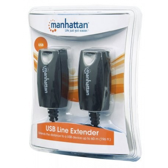 Use the Manhattan USB Line Extender to overcome the USB distance restriction and expand device and PC locations and better organize productive office arrangements. The Manhattan USB Line Extender can help extend a USB keyboard and mouse during presentations, operate a barcode scanner in retail point-of-purchase applications, access a printer in another room and improve other USB applications without signal loss or interference.