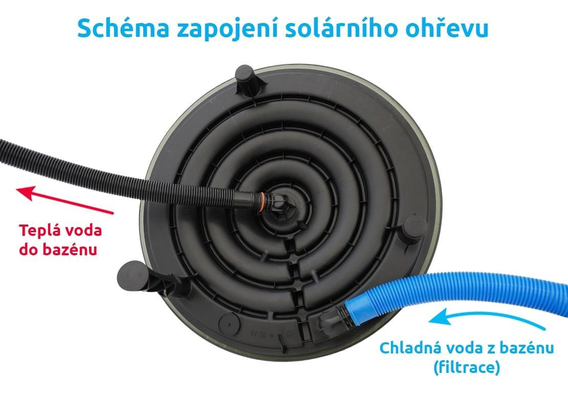 Součástí balení je solární ohřev, vrchní plastový kryt a trny na napojení 32 a 38 mm hadic.