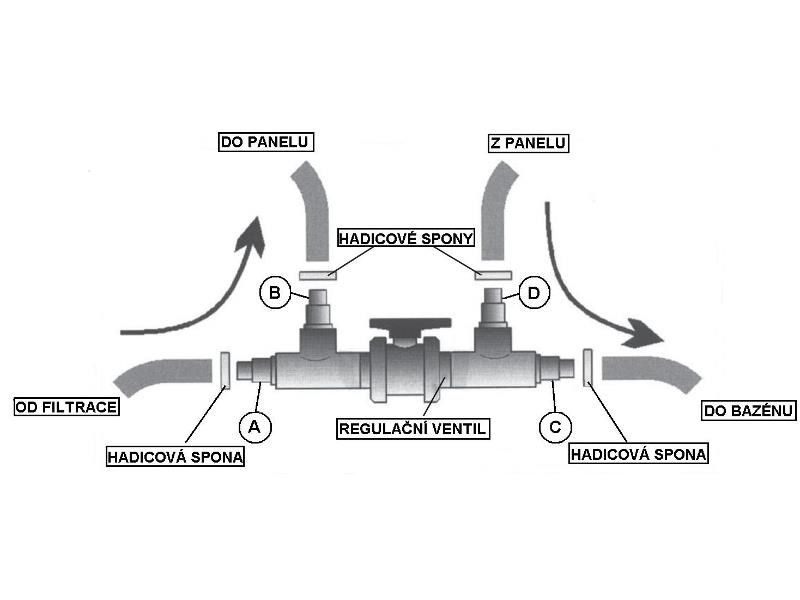 Toto rozdělení v podstatě funguje jako vypínač, či regulátor solárního ohřevu, kdy se přes ventil odkloní tok vody a proudí tak přímo zpět do bazénu. Pokud tedy na noční filtrování bazénu chcete solární ohřev "vypnout", neboť v nočních hodinách má solární ohřev opačný efekt a bazénovou vodu spíše ochlazuje, doporučujeme použít právě náš kulový ventil..