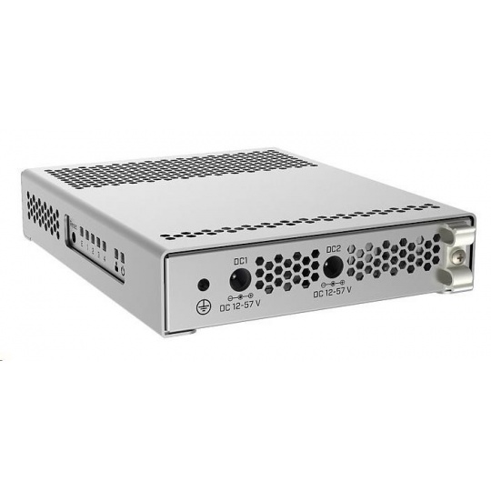 CRS305-1G-4S+IN je kompaktní, přesto velmi výkonný switch, který má čtyři SFP+ porty s rychlostí 10 Gbps/port. Zařízení má také kromě optických portů i jeden Gigabitový ethernet s podporou POE IN pro snadný přístup k zařízení, konfiguraci zařízení nebo jako převod na metalické vedení. K napájení slouží hned dva DC konektory pro redundanci napájení. Switch je velmi elegantní, kompaktní a jeho kovové pouzdro bez ventilátorů zajišťuje tichý provoz.