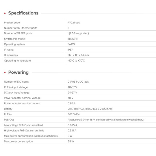 Venkovní konvertor z optického vlákna na metaliku s krytím IP67 a inteligentní správou pro optické a ethernetové instalace s integrovanou UPS funkcí. Na periferii sítě málokdy selže optické vlákno. Jsou to zpravidla nestabilní napájení, výpadky proudu, krátkodobé výpadky a poklesy napětí. Tyto nestability vyžadují renegociace, restartování zařízení a zbytečné žádosti o podporu. FTC21-ups je navržen tak, aby vám ušetřil starosti při řešení problémů s napájením. SwOS pokročilá funkcionalita FTC21 není jen jednoduchý mediální konvertor. Běží na něm plná verze SwOS Lite. Nabízí pokročilé funkce správy: • Monitorování a správa rozhraní • Podpora VLAN • Hlášení SNMP • Základní tvarování provozu • Pokročilé filtrování paketů pomocí seznamů řízení přístupu (filtrování paketů, účtování a značkování VLAN) Integrované baterie UPS FTC21-ups se odlišuje tím, co se stane, když dojde k nestabilitě napájení. Uvnitř se nachází dvojice lithium-iontových baterií NCA 18650. Nejsou určeny k provozu sítě po celou noc, ale k překonání krátkých výpadků, poklesů napětí a situací, kdy téměř dojde k selhání celého systému. Udržují spojení i při kolísání napájení a zabraňují tak zbytečnému opakovanému vyjednávání zařízení. Baterie je inteligentně řízena: • Během přepravy je neaktivní; • Aktivuje se při prvním zapnutí; • V případě potřeby lze pomocí SwOS vzdáleně přepnout do režimu přepravy. Příklady reálné výdrže baterie(20°C) Cube 60Pro (~13W, 45–55min) LHG 5 (~5–7W, 1–2h) SXT LTE7 kit (~3W, 6+h) Technické specifikace: Product code: FTC21-ups Number of 1G Ethernet ports: 2 Number of 1G SFP ports: 1 (2.5G supported) Switch chip model: 88E6341 Operating system: SwOS IP rating: IP67 Dimensions: 268 x 113 x 44 mm Operating temparature: -40°C to +70°C Napájení: Number of DC inputs: 2 (PoE-In, DC jack) PoE-In input Voltage: 48-57 V DC jack input Voltage: 24-57 V Power adapter nominal voltage: 48 V Power adapter nominal current: 0.95 A Battery: 2x Li-Ion NCA, 18650 (3.6V 2500mAh) PoE-In: 802.3af/at PoE-Out: Passive PoE 24 or 48 V, configured via a hardware switch (Ether2) Low voltage PoE-Out current limit: 0.625 A High voltage PoE-Out current limit: 0.315 A Max power consumption (without attachments): 3 W Max power consumption: 28 W.