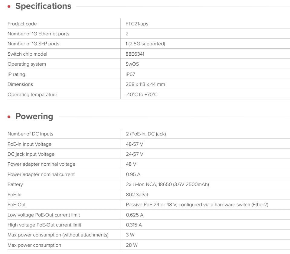 Venkovní konvertor z optického vlákna na metaliku s krytím IP67 a inteligentní správou pro optické a ethernetové instalace s integrovanou UPS funkcí. Na periferii sítě málokdy selže optické vlákno. Jsou to zpravidla nestabilní napájení, výpadky proudu, krátkodobé výpadky a poklesy napětí. Tyto nestability vyžadují renegociace, restartování zařízení a zbytečné žádosti o podporu. FTC21-ups je navržen tak, aby vám ušetřil starosti při řešení problémů s napájením. SwOS pokročilá funkcionalita FTC21 není jen jednoduchý mediální konvertor. Běží na něm plná verze SwOS Lite. Nabízí pokročilé funkce správy: • Monitorování a správa rozhraní • Podpora VLAN • Hlášení SNMP • Základní tvarování provozu • Pokročilé filtrování paketů pomocí seznamů řízení přístupu (filtrování paketů, účtování a značkování VLAN) Integrované baterie UPS FTC21-ups se odlišuje tím, co se stane, když dojde k nestabilitě napájení. Uvnitř se nachází dvojice lithium-iontových baterií NCA 18650. Nejsou určeny k provozu sítě po celou noc, ale k překonání krátkých výpadků, poklesů napětí a situací, kdy téměř dojde k selhání celého systému. Udržují spojení i při kolísání napájení a zabraňují tak zbytečnému opakovanému vyjednávání zařízení. Baterie je inteligentně řízena: • Během přepravy je neaktivní; • Aktivuje se při prvním zapnutí; • V případě potřeby lze pomocí SwOS vzdáleně přepnout do režimu přepravy. Příklady reálné výdrže baterie(20°C) Cube 60Pro (~13W, 45–55min) LHG 5 (~5–7W, 1–2h) SXT LTE7 kit (~3W, 6+h) Technické specifikace: Product code: FTC21-ups Number of 1G Ethernet ports: 2 Number of 1G SFP ports: 1 (2.5G supported) Switch chip model: 88E6341 Operating system: SwOS IP rating: IP67 Dimensions: 268 x 113 x 44 mm Operating temparature: -40°C to +70°C Napájení: Number of DC inputs: 2 (PoE-In, DC jack) PoE-In input Voltage: 48-57 V DC jack input Voltage: 24-57 V Power adapter nominal voltage: 48 V Power adapter nominal current: 0.95 A Battery: 2x Li-Ion NCA, 18650 (3.6V 2500mAh) PoE-In: 802.3af/at PoE-Out: Passive PoE 24 or 48 V, configured via a hardware switch (Ether2) Low voltage PoE-Out current limit: 0.625 A High voltage PoE-Out current limit: 0.315 A Max power consumption (without attachments): 3 W Max power consumption: 28 W.