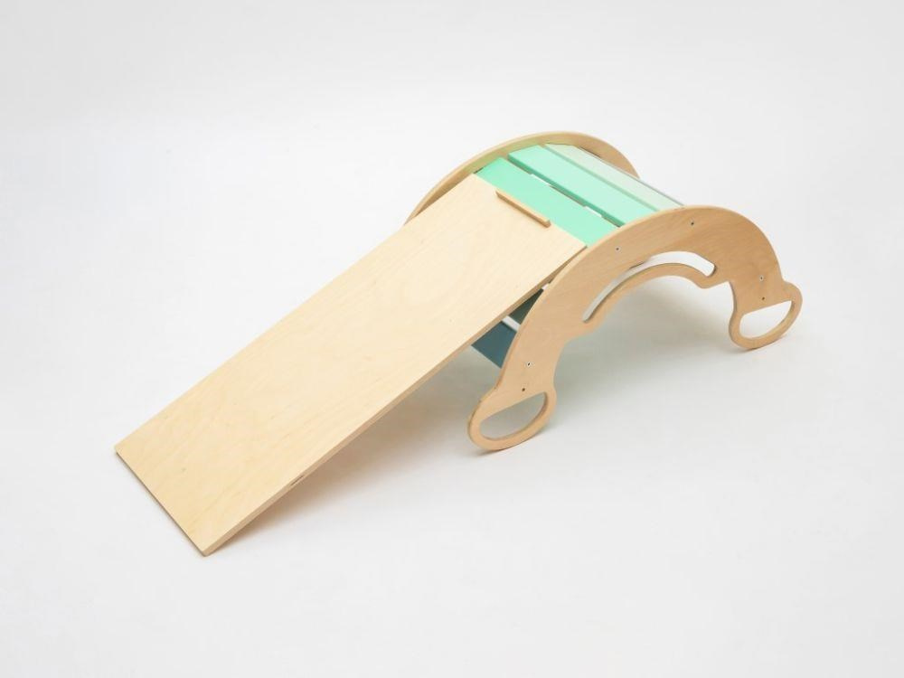 Dětská dřevěná Montessori houpačka smile 6in1, v příjemných pastelových barvách v modro-zelných tónech v kombinaci s neutrální šedou, vás překvapí svým designem i multifunkčností. Houpačka bude každý den svým širokým úsměvem lákat děti k příjemnému pohoupání i k zábavné hře. Její využití je všestranné, může být houpačkou, skluzavkou, prolézačkou, skrýší i sedačkou, při doplnění oboustranným prknem i dětským nábytkem. Oboustranné prkno není součástí houpačky. Vyrobená je z těch nejkvalitnějších materiálů, ručně dohladka opracovaná a lakovaná barvami s atestem. Montessori houpačka smile je širší než naše Montessori houpačky 5in1, proto k této houpačce nabízíme i speciální oboustranné prkno, které je doplňkem k houpačkám smile. Díky prknu snadno proměníte houpačku smile v dětský stoleček. Oboustranné prkno není součástí houpačky, pro využití houpačky jako nábytku je nutné prkno samostatně dokoupit..