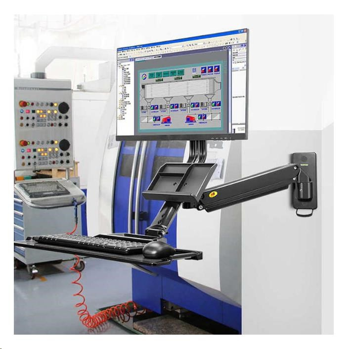 Kompletní specifikace Polohovatelná nástěnná pracovní stanice NB MB32 Profesionální držák na monitor 19" - 27" a klávesnici s myší, odkládací přihrádka, otáčení, náklon, výškové a délkové nastavení, VESA 75x75 a 100x100, nosnost 9kg, nejvyšší kvalita, systém vedení kabeláže, výškové polohování 480mm Profesionální držák na monitor a klávesnici, uchycení na svislou plochu (stěna, pilíř, sloup, stroje a zařízení). Polohování 3D - otáčení do stran, náklon monitoru, odsouvání a přisouvání ode zdi, výškové polohování (bez použití nářadí - dotykové), rotace monitoru (otočení na šířku nebo na výšku). Držák je vhodný pro zavěšení všech typů monitorů a All in One PC s úhlopříčkou 19" až 27" a hmotností 2-9kg. Police na klávesnici a myš s rozměry 560x200mm (možnost zaklopení) a přihrádka na dokumenty, vizitky, mobil a poznámky. Nejvyšší kvalita zpracování, snadná instalace a nastavitelnost. Systém skrytého vedení kabeláže. Barevné provedení černé. Držák na monitor nebo All in One Pc včetně poličky na klávesnici a myš, 3D polohování, profesionální, do kanceláře, výrobní haly, na stoje CNC a obráběcí, uchycení na svislou plochu nebo zeď - NB MB32 Technické údaje: nastavitelná nosnost dle hmotnosti monitoru 2kg až 9kg na monitory a All in One PC s úhlopříčkou 19" až 27" podpora VESA standardu 75x75 a 100x100 police na klávesnici a myš s rozměry 560mm x 200mm (možnost zaklopení, délková regulace 60mm) přihrádka na dokumenty, vizitky, poznánky, bločky, mobilní telefon otáčení do stran +/- 90° náklon obrazovky +12° / -12° výškové nastavení samotné obrazovky 100mm výškové polohování celého držáku 480mm rotace obrazovky PIVOT - natočení do vodorovné nebo svislé polohy vzdálenost od zdi 90mm až 1010mm plynová pružina pro výškové polohování bez použití nářadí (dotykové) systém pro vedení kabeláže materiál hliník, kryty plastové nejvyšší kvalita barevné provedení černé záruka 3 roky Držák All in One Pc nebo monitoru s poličkou na klávesnici a myš, uchycení na stěnu nebo svislou plochu, ideální do výroby, na stroje, CNC, obráběcí, do malých místností atd. - NB MB32 Držák na monitor NB MB32 podporuje VESA standardy: VESA 75x75 VESA 100x100 3D polohovatelný držák na monitor All in One Pc a klávesnici, uchycení na zeď nebo svislou plochu NB MB32 Nastavení výšky bez použití nářadí, snadno a rychle: Držák má integrovaný plynový píst, který po zavěšení monitoru otáčením imbusového klíče nastavíte na jeho hmotnost. Poté již bude držák zůstávat vždy v takové výšce, do které ho zatlačením na monitor nebo vytlačením dáte. Regulace výšky je možná v rozmezí 480mm. Ergonomická kancelář, držák monitoru a klávesnice s myší NB MB32 Kde lze držák monitoru nebo All in One PC s poličkou na klávesnici a myš použít: firmy, společnosti v kancelářích malé místnosti, práce bez stolu (možnost rychlého nastavení pro práci v sedě nebo vestoje) v dílnách v továrnách pozice na strojích (CNC, obráběcí atd.) ve skladech v domácnostech.