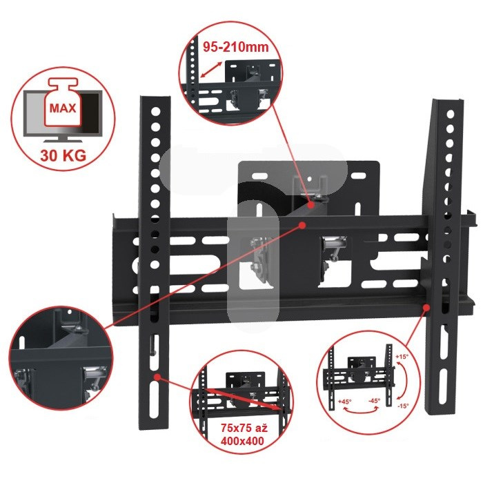 Otočný a sklopný držák na Tv 26-55", vzdálenost od zdi 95-240mm, robustní ocelová konstrukce, velká instalační nástěnná deska, VESA 75x75 až 400x400, nosnost 30kg.... více