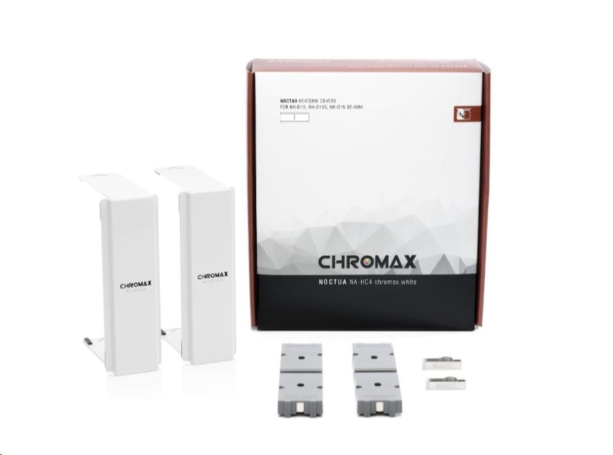 Kryty chladiče NA-HC4 chromax.white jsou doplňkovým příslušenstvím pro oceňované chladiče CPU NH-D15, NH-D15S a NH-D15 SE-AM4 od společnosti Noctua. Vyrobeny z vysoce kvalitního hliníku s bílou práškovou povrchovou úpravou, umožňují uživatelům dát chladiči elegantní sněhobílý vzhled, který se skvěle hodí do celobílých nebo černobílých sestav. Díky snadné a přímočaré instalaci změna vzhledu chladiče NH-D15(S) trvá jen několik minut a nevyžaduje ani jeho demontáž z procesoru. V kombinaci s ventilátory chromax.black.swap edition NF-A15 a jejich bílými antivibračními podložkami vám kryty NA-HC4 chromax.white dávají možnost proměnit váš NH-D15(S) v černobílý výkonný stroj, který vypadá stejně skvěle, jako chladí.