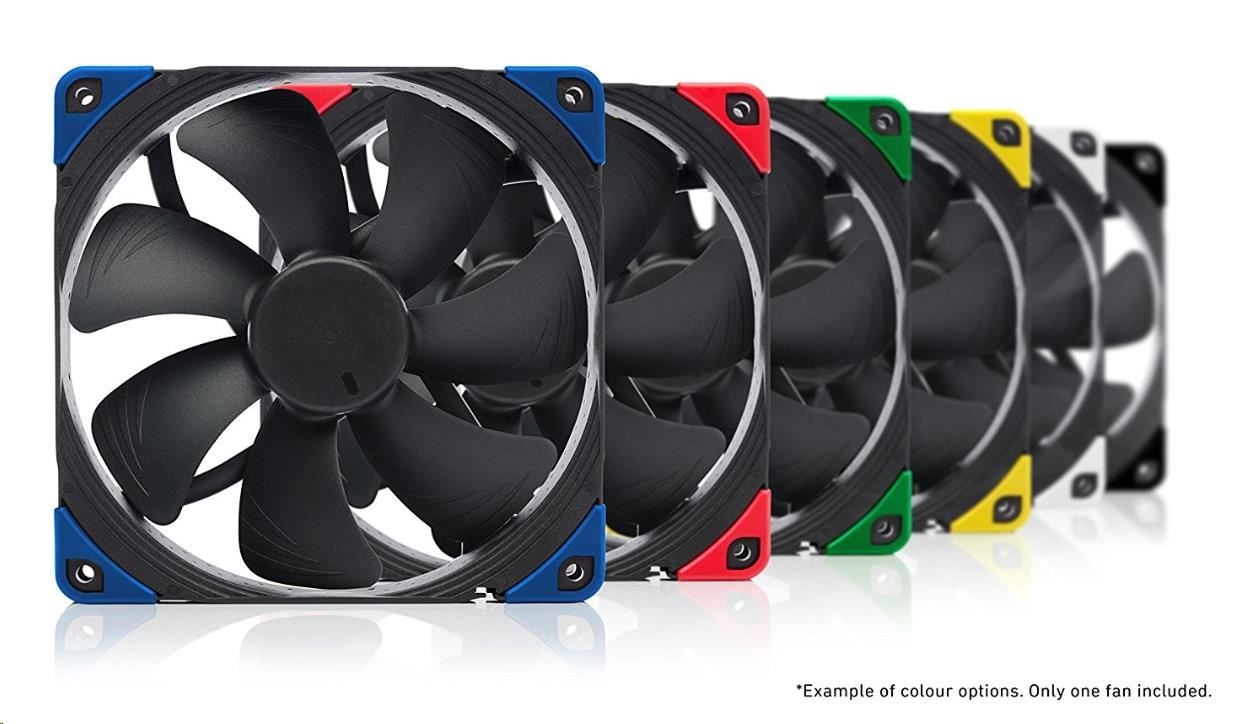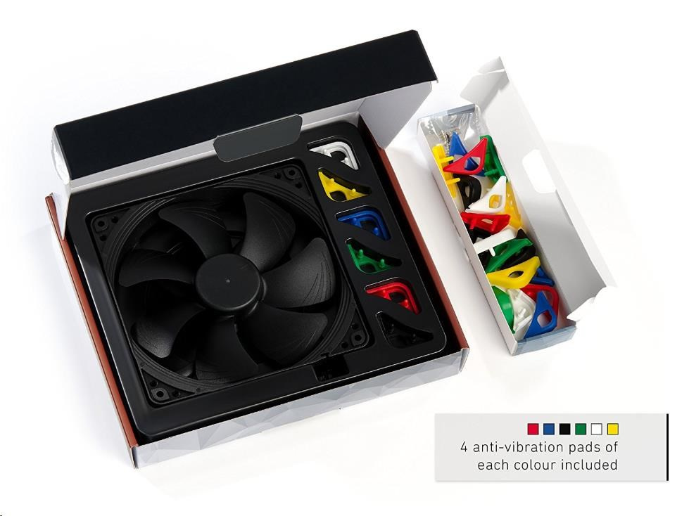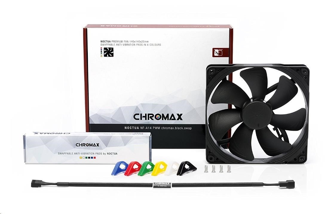 ventilátor, rozměry 140x140x25mm, max. hlučnost 24.6dBA, průtok 140.2m3/h, 300 až 1500 otáček, 4pin PWM, ložisko SSO2, edice Chromax - vyměnitelné barevné antivibrační podložky