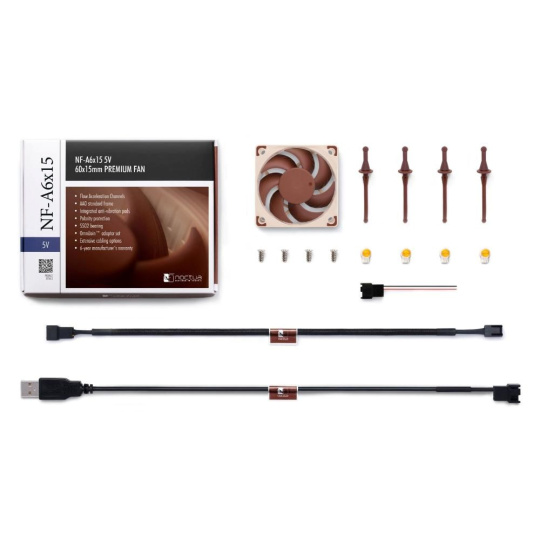 NF-A6x15 5V je speciální 5V verze vysoce optimalizovaného tichého 60x15mm ventilátoru Noctua s pokročilými aerodynamickými opatřeními, jako jsou Flow Acceleration Channels a rám Noctua AAO. Technologie Smooth Commutation Drive a ložisko Noctua SSO2 referenční třídy zaručují vynikající plynulost chodu a vynikající dlouhodobou stabilitu. Díky modulární kabeláži, sadě adaptérů OmniJoin™ a šestileté záruce výrobce je NF-A6x15 5V prvotřídní volbou pro náročné 5V aplikace.
