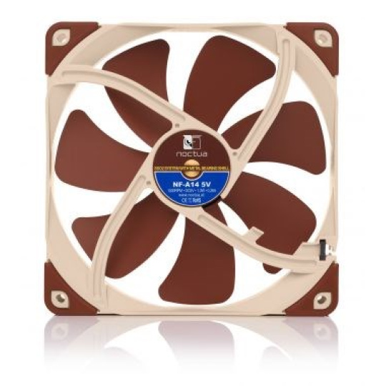 NF-A14 5V je vyhrazená 5V verze oceňovaného ventilátoru Noctua prémiové kvality NF-A14 140 mm. Díky standardnímu rámu AAO (Advanced Acoustic Optimization) a sofistikovaným aerodynamickým konstrukčním opatřením, jako jsou kanály zrychlení průtoku, je NF-A14 proslulý svým vynikajícím výkonem a vynikajícím tichým provozem. Technologie Smooth Commutation Drive a ložisko Noctua referenční třídy SSO2 zaručují vynikající hladký chod a vynikající dlouhodobou stabilitu. NF-A14 5V doplněný přiloženým kabelem napájecího adaptéru USB, sadou adaptérů OmniJoin™ a 6letou zárukou výrobce je prémiová volba pro náročné 5V aplikace.