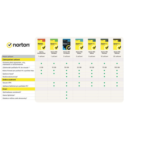 Elektronická licence Norton 360 Deluxe poskytuje komplexní ochranu před malwarem až pro 5 počítačů PC, počítačů Mac, zařízení se systémem Android nebo iOS, plus funkci rodičovské kontroly, která pomáhá chránit vaše děti online, správce hesel pro ukládání a správu hesel a funkci zálohování PC do cloudu. Norton 360 Deluxe zahrnuje také síť VPN pro 5 zařízení a aplikaci ochrana kamery před zneužitím pro počítače PC. Určeno pro nové uživatele i k obnově licencí stávajících uživatelů