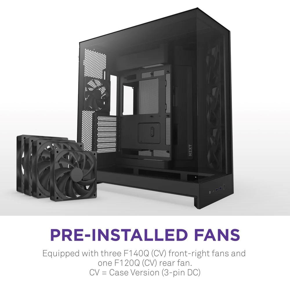 • Předinstalované ventilátory: Obsahuje tři ventilátory F140Q (CV) v pravé přední části a jeden ventilátor F120Q (CV) v zadní části. CV = verze pro skříň (3-pin DC)