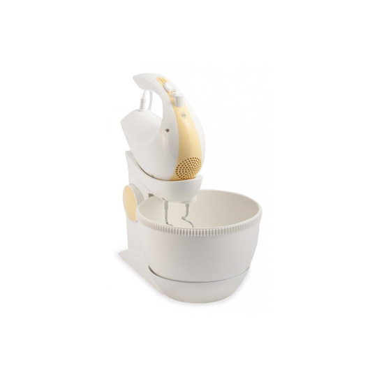 Elektrický ruční šlehač s otočnou nádobou, 5 rychlosti a funkce TURBO pro maximální výkon, 2,5 l otočná nádoba s mechanickým pohonem, Sada šlehacích metel a metel na hnětení, Výklopné rameno, Napájení: 230V~ 50Hz, 300 W.
