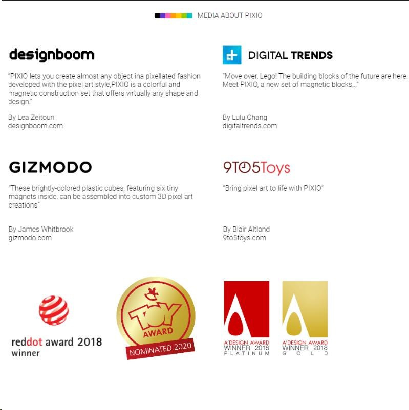 PIXIO získalo několik prestižních ocenění jakými jsou Red Dot Award, TOY AWARD, A´DESIGN