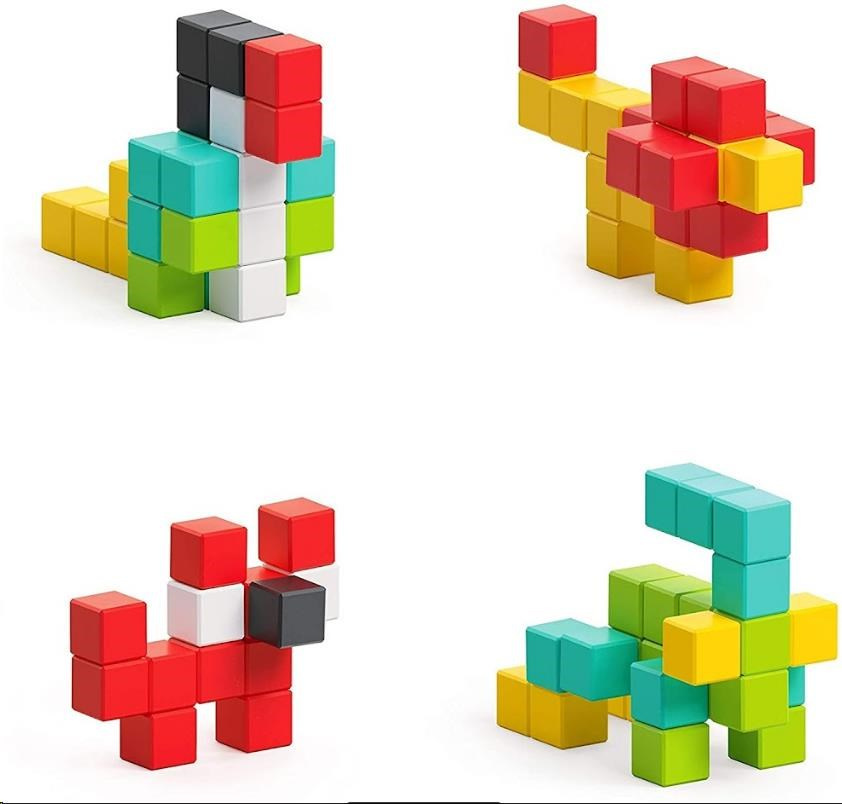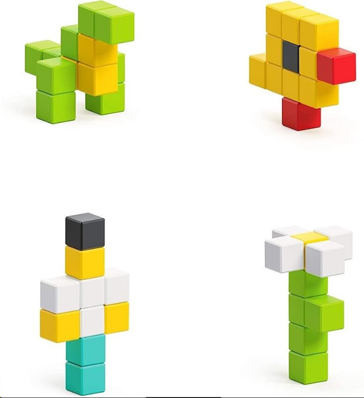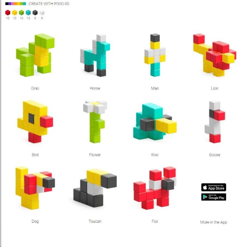 Každý z magnetických bloků PIXIO je kostka o velikosti 8x8x8mm. Uvnitř je 6 malých magnetů vážících méně než 1 g. Chytrý a unikátní design magnetů dávají nekonečné možnosti skládaní obrazců – neexistuje špatný postup, jak stavět a tvořit, protože jde jenom o kreativitu, představivost a šikovnost tvůrce. Všechny modely PIXIO jsou mezi sebou kompatibilní.