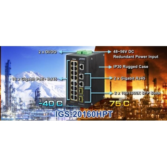 Planet IGS-20160HPT, 18x 1000BASE-T, 16x PoE 320W, 2x SFP, DIN, IP30, -40 AŽ 75°C, WEB/SNMPV3