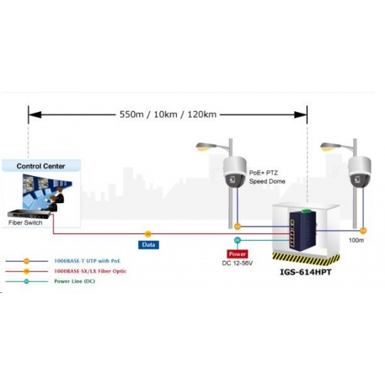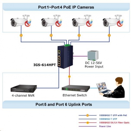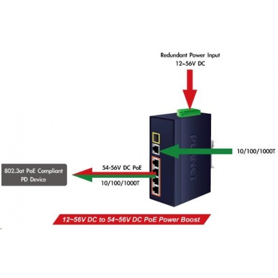 Planet IGS-614HPT, PoE switch, 5x 1000Base-T, 1x SFP, 4x PoE 802.3at, -40~+75°C, 12-56VDC, dual-power, DIN