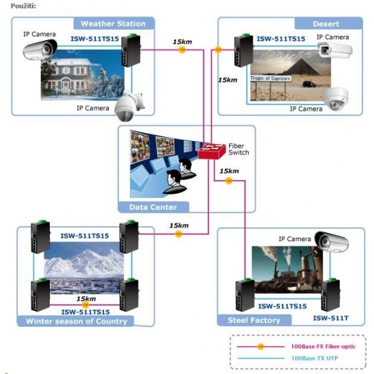 Planet ISW-511T, 4x 10/100Base-TX+ 1x 100FX 2km, MM, DIN, IP30, -40~75°C Přepínače pro průmyslový Ethernet jsou určeny do náročných provozních podmínek s velkým rozsahem pracovních teplot, nejistým napájením a častými otřesy. Přepínače řady ISW se snadno instalují na standardní DIN lištu nebo přímo na zeď a umožňují nasazení dobře známé Ethernetové technologie i v průmyslovém prostředí. Stejně tak jsou vhodné pro instalace do venkovně umístěných skříní s velkým kolísáním pracovních teplot (typicky bezdrátové a MAN ISP aplikace). Vlastnosti: - 4 porty 100Base-TX, Switching, Full Duplex (100/200 Mbps), Auto-Negotiation (10/100 Mbps), automatická detekce přímý/křížený kabel na každém portu - 1 port 100Base-FX, full duplex, SC konektory, multimodemode, pro 50/125um a 62,5/125um vlákno, dosah 2km, vlnová délka 1300nm, zdvih min. 15,5dB (vysílací výkon max. -14dBm, min. -19dBm, přijímací citlivost -34,5dBm) - 1M buffer, propustnost sběrnice 1Gbps, 0,74Mpps (64B), tabulka 2k MAC adres - pole LED indikátorů pro diagnostiku provozu - instalace na DIN lištu, montážní díl součástí - instalace na zeď, montážní díl součástí - krytí IP30, skříň celohliníková - napájení: 12-48V DC redundantní, připojení možné ze dvou různých zdrojů (nejsou součástí balení) - ochrana proti přepólování, připojení napájení na svorkovnici, umístění na spodním panelu (nepřekáží při montáži na zeď) - QoS prioritizace provozu dle portu, ToS, 802.1p - zařízení je odolné proti pádu (IEC-60068-2-32) z výšky 75cm na všechny dopadové části - zařízení je odolné proti vibracím (IEC-60068-2-6) 10-500-10Hz, 4x g, 0,5oct/min - zařízení je odolné proti přetížení krátkodobému zrychlení 50g, dlouhodobému 4g, (IEC-60068-2-27) - EMI/EMS, elektromagnetická kompatibilita a slučitelnost dle CE EN-6100-4-2,3,4,5,6 - elektrická bezpečnost dle CE EN-60950 - pracovní teplota -40 až 75°C, vlhkost do 95% - příkon do 14W - rozměry: 135 x 97 x 32 mm - hmotnost: 436g.
