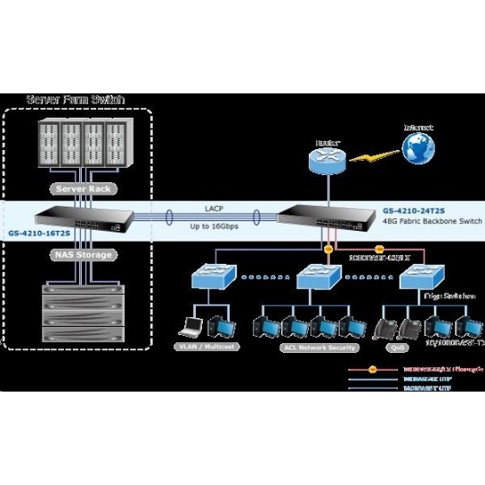 Gigabitový spravovatelný přepínač pro instalaci do náročnějších lokálních sítí, disponuje širokou škálou funkcí pro zajištění provozu bezpečné sítě eliminací možných útoků na nižších vrstvách modelu OSI a možnou autentizací koncových zařízení. Připojení koncových uživatelů lze zabezpečit ACL/MAC pravidly nebo možnou autorizací na server RADIUS/TACACS. Bezpečnou správu zajistí šifrovaná webová správa nebo SNMPv3 protokol prostřednitcvím IPv4 nebo nově IPv6 protokolem. náhrada za GSW-2404SF - 24 portů 1000Base-T, Switching, Full Duplex (1000/2000 Mbps), Auto-Negotiation (10/100/1000 Mbps) - 2x SFP, 100/1000Base-X, pro instalaci optických modulů mini-GBIC s označením MFB a MGB - Auto-MDI/MDI-X, automatická detekce přímý skřížený kabel i pro 10/100Mbps - 8k MAC adres, 4,1MB buffer - propustnost: 52Gbps sběrnice, datově 38,6Mp/s (64B) - podpora přenosu Jumbo rámců o velikosti 9KB - správa: WEB / SNMPv3 / telnet / konzole(COM port); plná podpora protokolů IPv4/IPv6 - VLAN IEEE 802.1Q, až 256 skupin, až 4094 VLAN ID, protokolové VLAN, VoIP-VLAN - agregace portů LACP dle IEEE 802.3ad, až 8 skupin po 8-mi portech - QoS 8 úrovní pro 8 front; klasifikace podle provozu, váženého průměru nebo příznaků IEEE 802.1p a DSCP - Port shaper: datová limitace rychlosti - Spanning tree protokol IEEE 802.1D: STP / RSTP / MSTP - IGMPv3 Snooping, Querier, až 256 multicast skupin - podpora LLDP protokolu - zrcadlení portů-port mirroring: TX / RX / TX+RX - zabezpečení klientů: ACL (access control list), MAC statická tabulka pro autentizovaná zařízení, podpora ověření vůči serverům RADIUS/TACACS+, DHCP snooping - ochrana DoS proti útokům v síti, StormControl proti eliminaci chybných provozů - pole LED indikátorů pro diagnostiku provozu - ESD ochrany proti statické elektřině - rozměry: (445 x 207 x 45)mm, hmotnost 2,1kg - provedení rackmount 19"/1U - provozní teplota: 0-50°C - interní napájecí zdroj AC 110-240V/50-60Hz, vlastní příkon do 14W - fanless: žádný ventilátor.