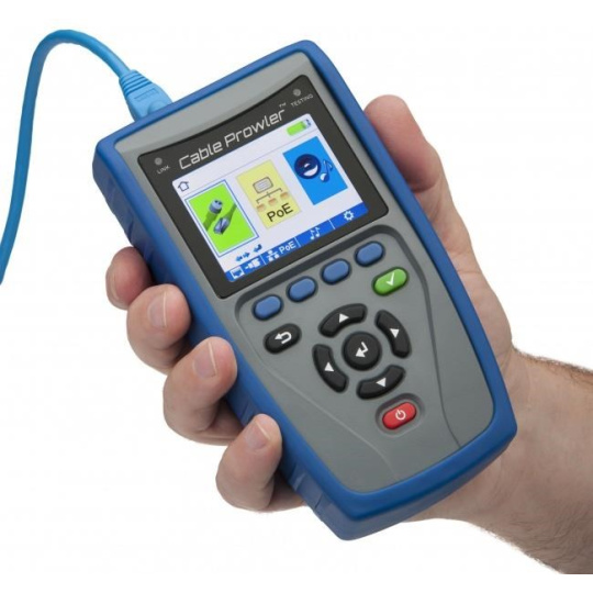 - Testuje ethernet a kotroluje konektivitu včetně testů pro zkraty, přehozené páry, špatně zapojené páry, neukončené kabely