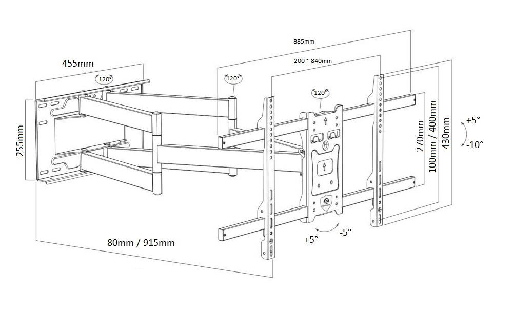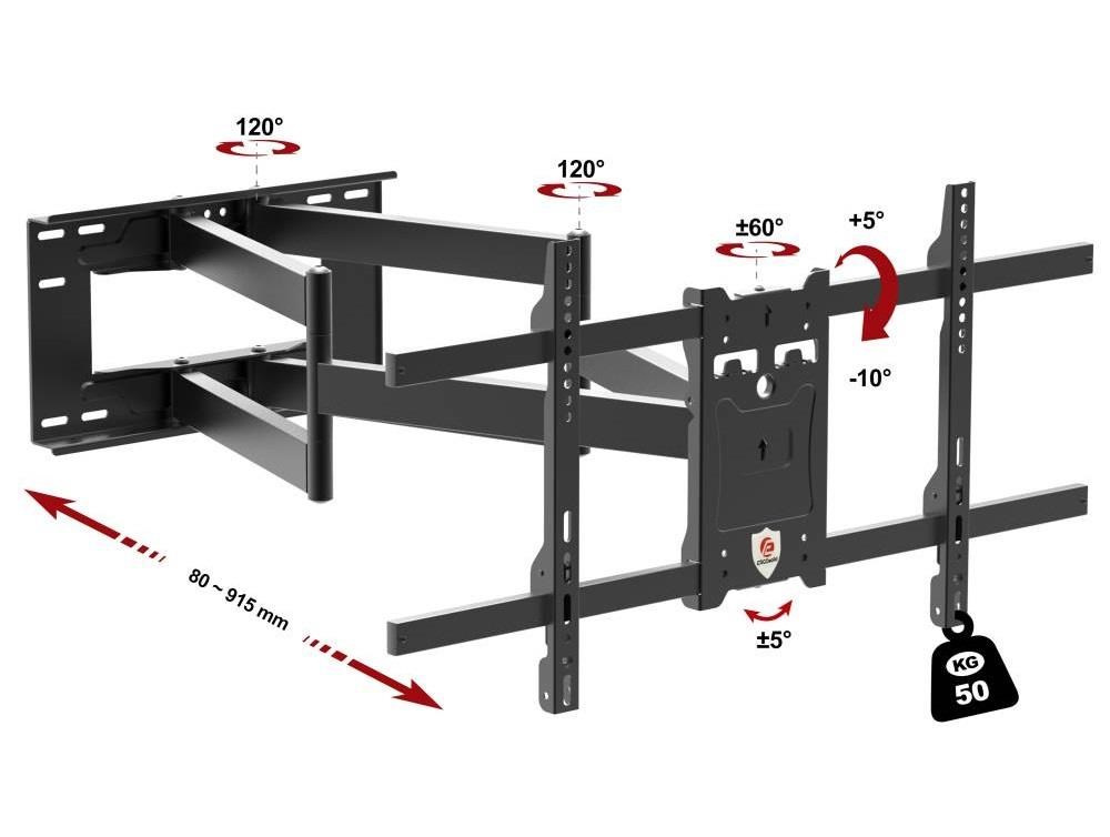 Kvalitní nástěnný držák na Tv 43-90", výsuvný 80-915mm, otočný +/-65°, náklon +5°/-10°, korekce roviny +/-5°, VESA 200x100 až 800x400, nosnost 50kg.... více