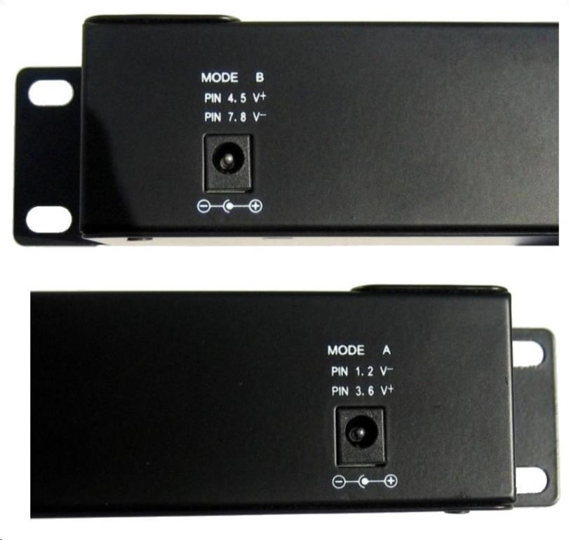 Vstup pro napájení prostřednictvím dvou 2.1mm 60V jacků, z obou vstupů je vždy zároveň napájeno všech 12 portů v režimu dle zvoleného A/B vstupu: